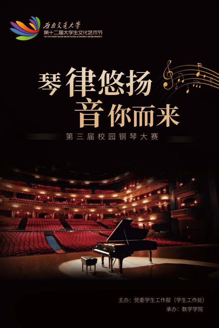 选手需以视频形式自行录制一首由本人演奏的完整钢琴曲目,演奏风格不限,鼓励选择与学校历史、校园生活、青春活力相关的曲目。视频时长不超过8分钟,选手可自选场地进行视频拍摄,务必确保声音与画面清晰。请于4月24日前将视频发送至邮箱 mathxsh@swjtu.edu.cn,邮件主题统一为:钢琴比赛+姓名+电话。