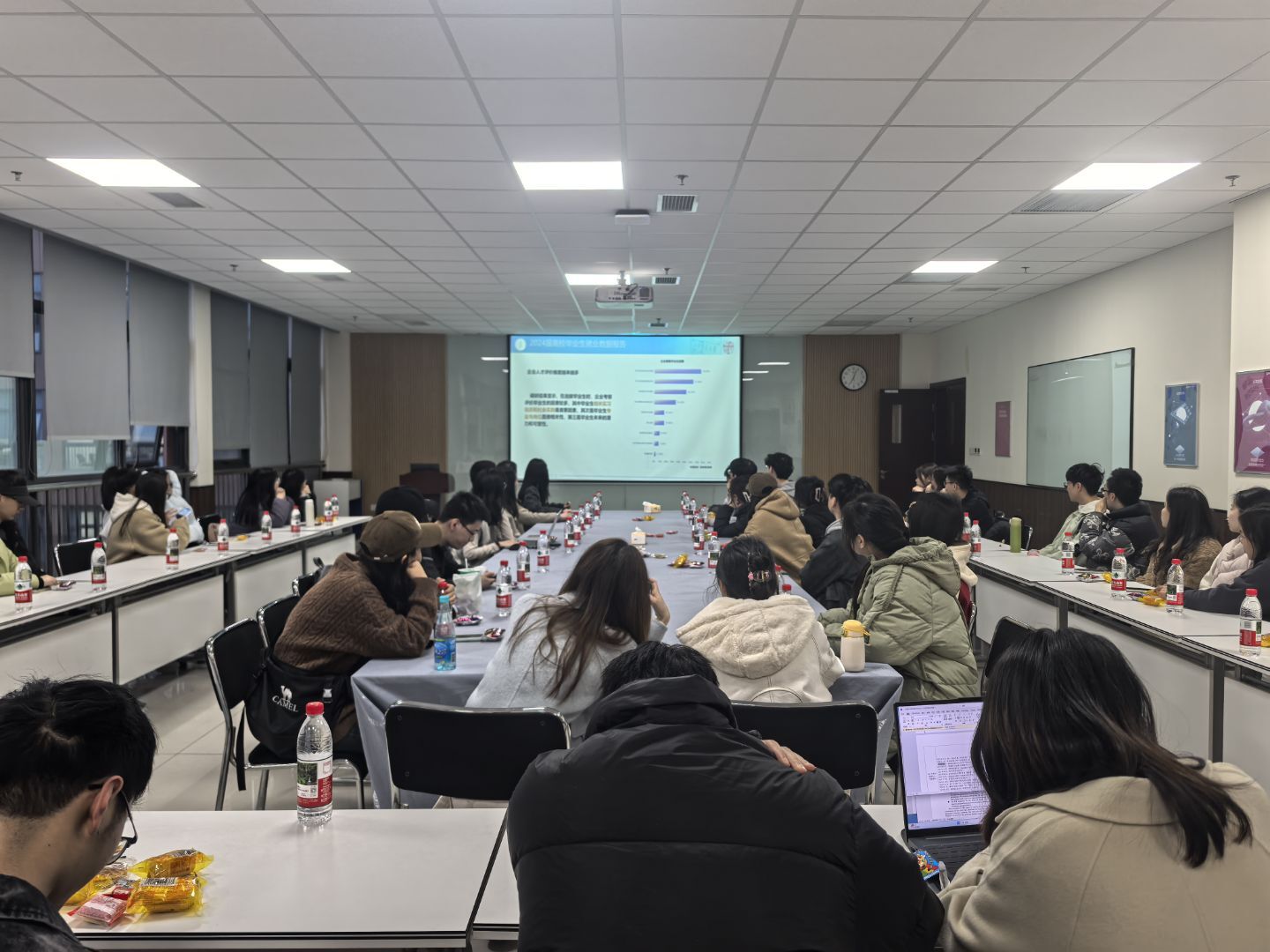 会议伊始,盖少通老师从就业市场趋势、企业人才评价维度、毕业生职位需求和威廉希尔亚洲公司硕士毕业生就业情况等方面进行了分析,并鼓励大家充分利用交大智慧就业网,借助学校丰富的资源助力职业规划。