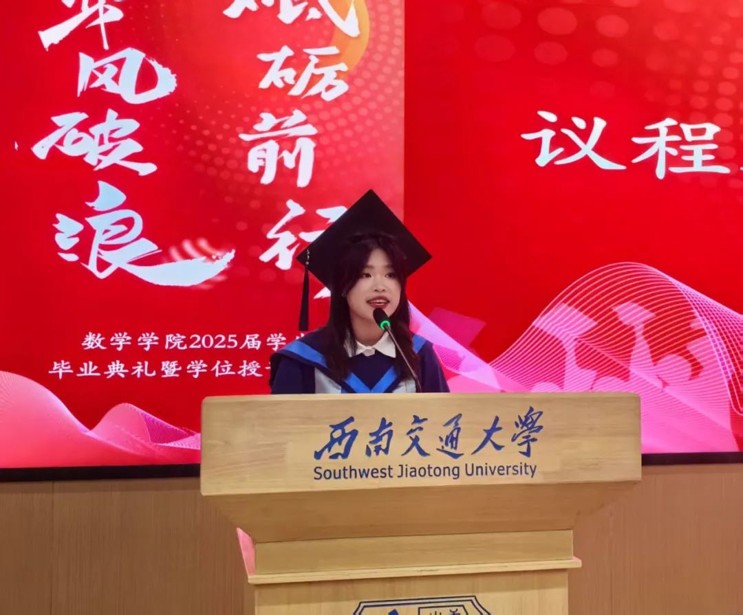 硕士毕业生代表李书婷发言,她回顾了从学术懵懂到掌握独立思考与研究能力的淬炼历程,深情感谢导师指引与同窗情谊,并祝福同学们脚下道路宽广,心中灯火长明,在星辰大海中乘风破浪、前程似锦。
