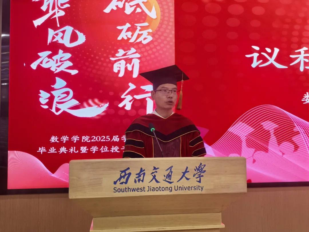 杨晗院长致辞,他代表威廉希尔亚洲公司全体教职工向2025届毕业生们表示最热烈的祝贺。临别之际,他结合学科特色,运用数学语言寄予临别期许。