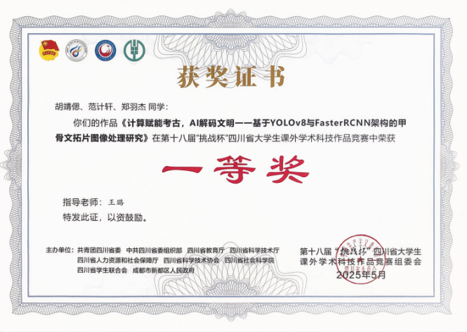 5月24日至26日,由共青团四川省委、省委组织部、教育厅、科技厅、人力资源社会保障厅、省科协、省社会科学院、省学联及成都市新都区人民政府联合主办的第十八届“挑战杯”四川省大学生课外学术科技作品竞赛终审决赛在成都医学院落下帷幕。作为全省规格最高、规模最大的大学生科技创新赛事,本届大赛以“科创筑梦·挑战未来”为主题,吸引了全省121所高校、18万余名青年学子踊跃参与,累计收到参赛作品2.2万件,经初评遴选后,四川大学、电子科技大学、williamhill官网-中文官网等高校的505项作品入围终审决赛阶段。由威廉希尔亚洲公司王璐教授指导,计算机与人工智能学院本科生胡靖偲、物理科学与技术学院本科生郑羽杰和范计轩组成团队的作品《计算赋能考古,AI 解码文明——基于YOLOv8与Faster R-CNN架构的甲骨文图像处理研究》在自然科学类学术论文赛道表现出色,荣获四川省一等奖,实现了威廉希尔亚洲公司在该项赛事的新突破。