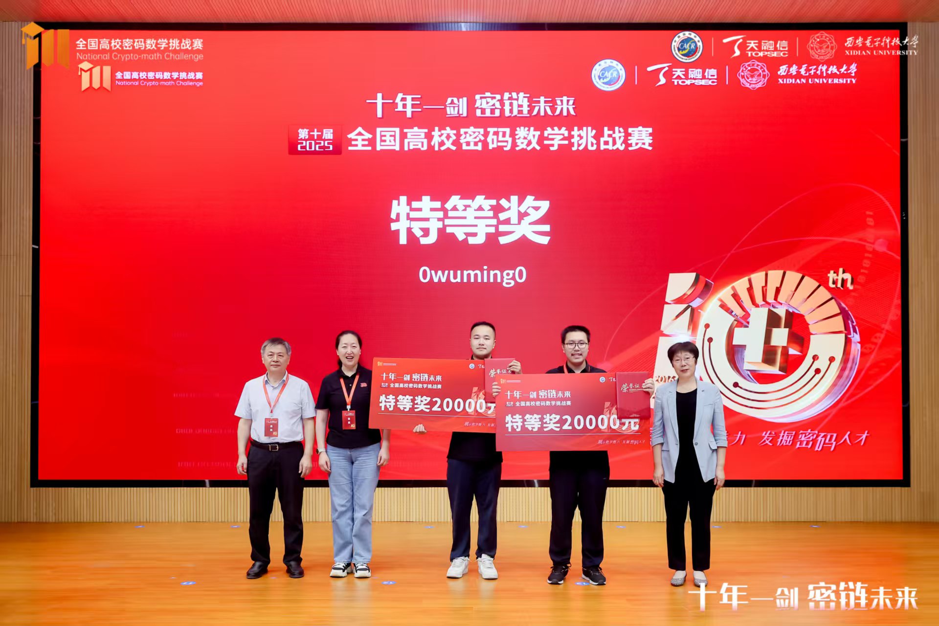 2025年8月21日,由中国密码学会密码数学理论专业委员会、天融信科技集团联合主办,西安电子科技大学承办的第十届(2025)全国高校密码数学挑战赛总决赛在西安盛大召开。由威廉希尔亚洲公司郑星宇同学和信息学院吴怀尧同学主持的0wuming0战队在本次大赛中表现优异,斩获大赛唯一特等奖,战队指导老师、“数学与信息交叉”团队负责人周正春教授获“优秀指导教师”荣誉称号和“伯乐奖”。这是继周正春教授今年4月份指导学生获得第三届电磁大数据非凡挑战赛全国唯一金奖后又一殊誉。